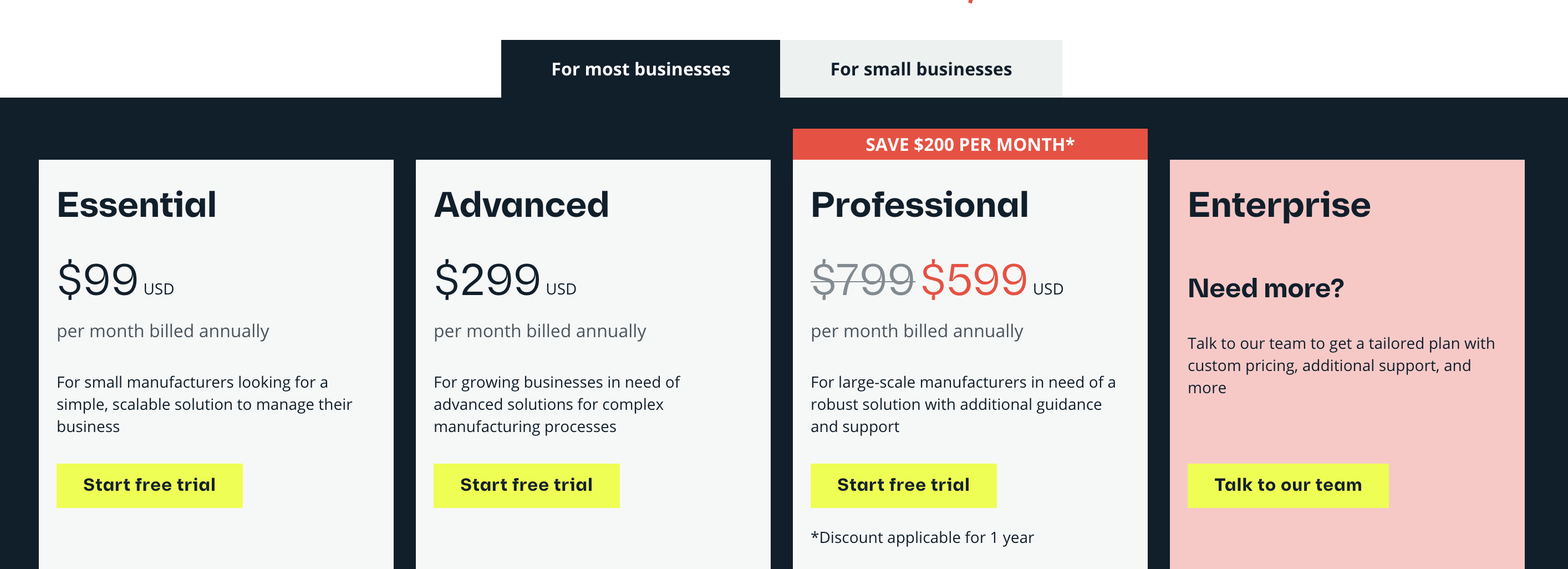 You are addressing several different customer segments, so implementing pricing tiers is an excellent idea. If you design your tiers correctly, you can ensure that potential customers find themselves in one of the tiers and confidently make a buying decision. Keep your ideal customer profiles in mind when designing the tiers and ensure there’s a tier that perfectly suits each of them. Tiers allow you to have customers start with an affordable plan, giving you the opportunity to upsell them later into a more expensive one. This approach offers customers a more personalized experience as they feel better understood. Examples: Apple iCloud for individuals, Aira, Aurora Solar, Tribe, Avalara, Katana